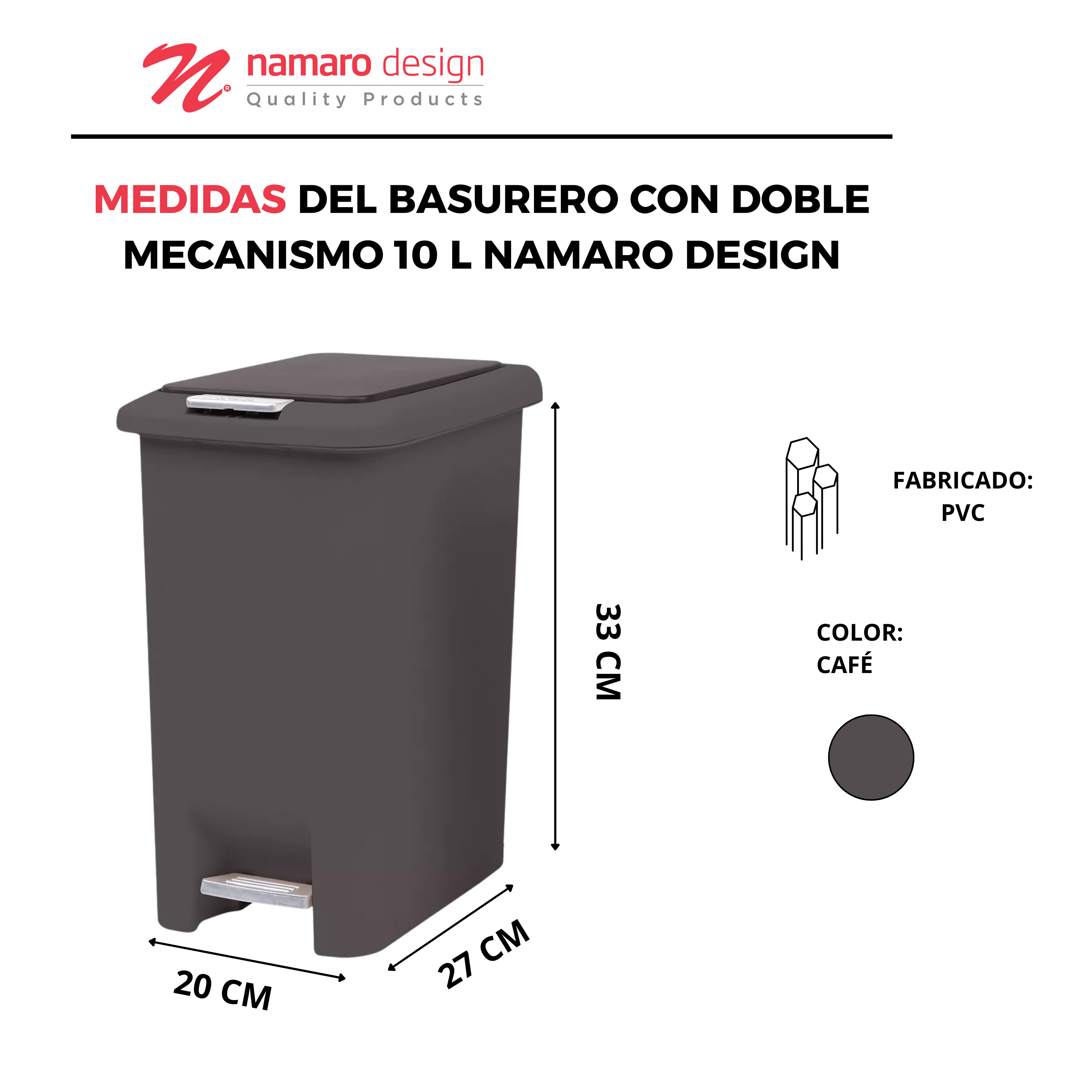 Basurero con Doble Mecanismo color Gris con capacidad de 10L.-Pedal y touch para abrir Pedal con Antiderrapante.-Fabricado en plástico resistente.-Con capacidad de 10L.-Ideal para Cocina y Oficina.-Alta calidad y desempeño.Medidas:Largo: 27 cmAncho: 20 cm Altura: 33 cm Namaro Design